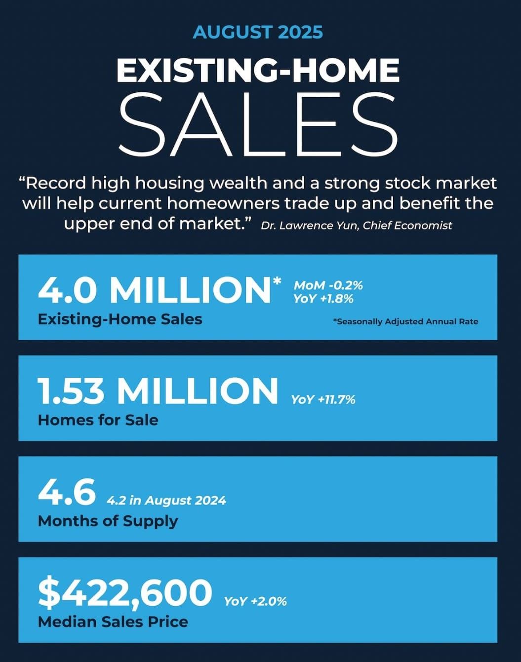 - $422,600: Median existing-home price for all housing types, up 2.0% from one year ago ($414,200)—the 26th consecutive month of year-over-year price increases.