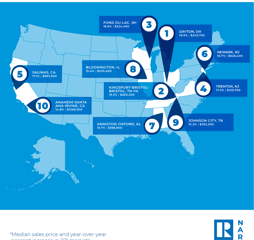 The top 10 metro areas with the largest year-over-year median price increases, which can be influenced by the types of homes sold during the quarter, all recorded gains of at least 14.8%. Those include Dayton, OH (19.9%); Kingsport-Bristol-Bristol, TN-VA (19.2%); Fond du Lac, WI (18.6%); Trenton, NJ (17.3%); Salinas, CA (17.1%); Newark, NJ-PA (16.7%); Anniston-Oxford, AL (15.7%); Bloomington, IL (15.4%); Johnson City, TN (15.2%); and Anaheim-Santa Ana-Irvine, CA (14.8%).