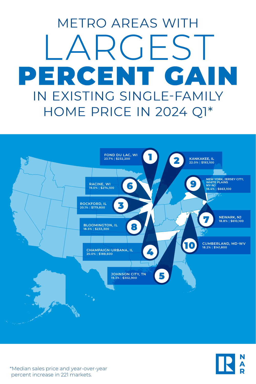 WASHINGTON—More than 90% of metro markets (205 out of 221, or 93%) posted home price gains in the first quarter of 2024, as the 30-year fixed mortgage rate ranged from 6.60% to 6.94%, according to the National Association of Realtors’ latest quarterly report released today (May 8). Thirty percent of the 221 tracked metro areas experienced double-digit price gains over the same period, up from 15% in the fourth quarter of 2023.