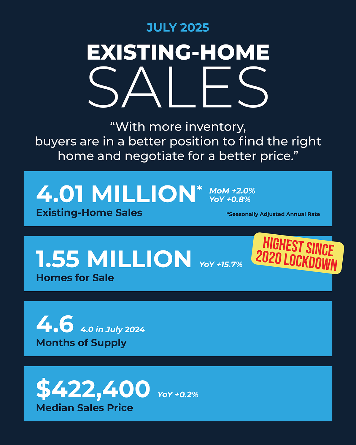 - 1.55 million units: Total housing inventory, up 0.6% from June and increased 15.7% from July 2024 (1.34 million).