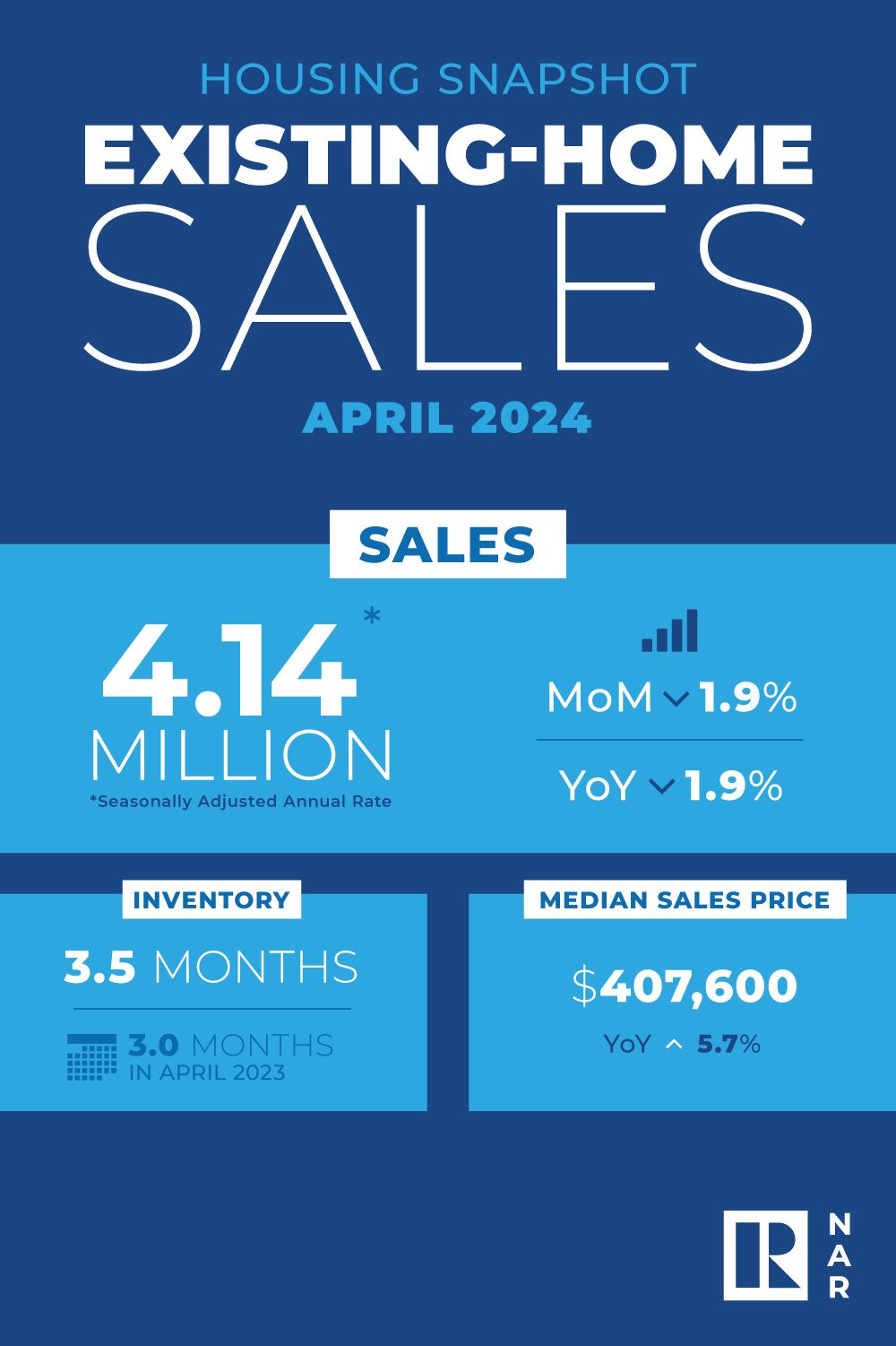 Total existing-home sales—completed transactions that include single-family homes, townhomes, condominiums and co-ops—slid 1.9% from March to a seasonally adjusted annual rate of 4.14 million in April. Year-over-year, sales fell 1.9% (down from 4.22 million in April 2023).