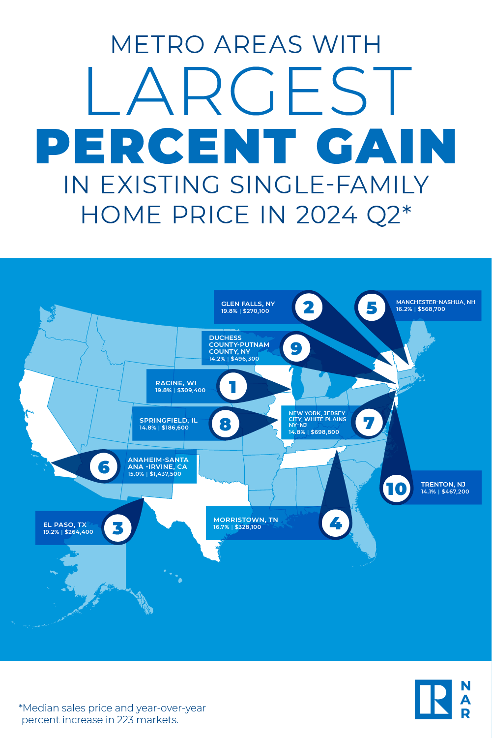 The top 10 metro areas with the largest year-over-year median price increases, which can be influenced by the types of homes sold during the quarter, all posted gains of at least 14.1%. Five of the markets were in the Northeast. Overall, those markets were Racine, Wis. (19.8%); Glens Falls, NY (19.8%); El Paso, TX (19.2%); Morristown, TN (16.7%); Manchester-Nashua, NH (16.2%); Anaheim-Santa Ana-Irvine, CA (15.0%); New York-Jersey City-White Plains, NY-NJ (14.8%); Springfield, IL (14.8%); Dutchess County-Putnam County, NY (14.2%); and Trenton, NJ (14.1%).