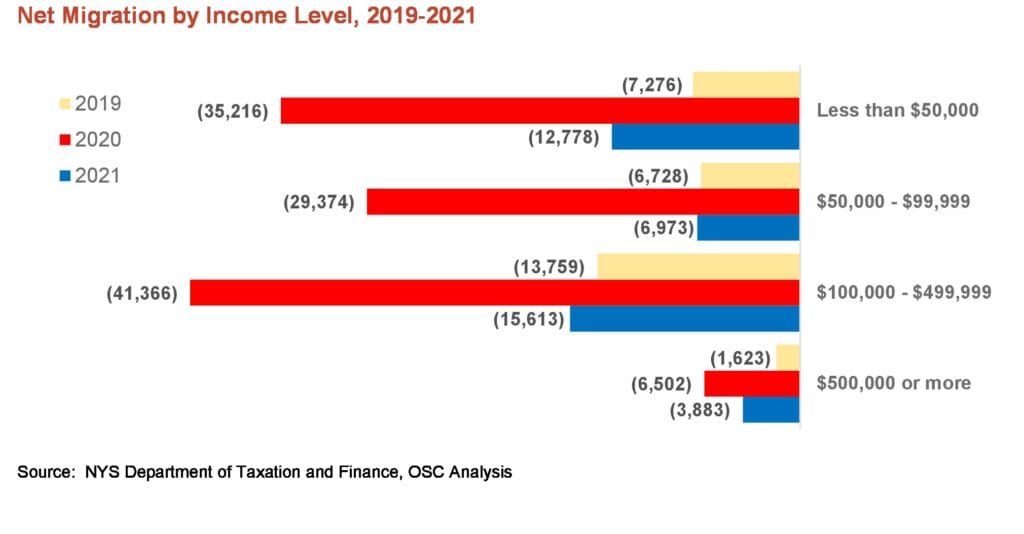 The report stated: “In terms of the scale of out-migration, 2020 appears to have been an aberration, but the state has steadily experienced an increase in part-time resident filers and more people have been exiting New York than moving to the state on a net basis. …In particular, middle-class families have been leaving the state at the highest rates, and these rates, while lower than 2020, remained elevated beyond pre-pandemic trends in 2021.” This data is in agreement with the Fiscal Policy Institute study which concluded that a greater number of middle-class families have been looking for the exits and relocating out of New York State.